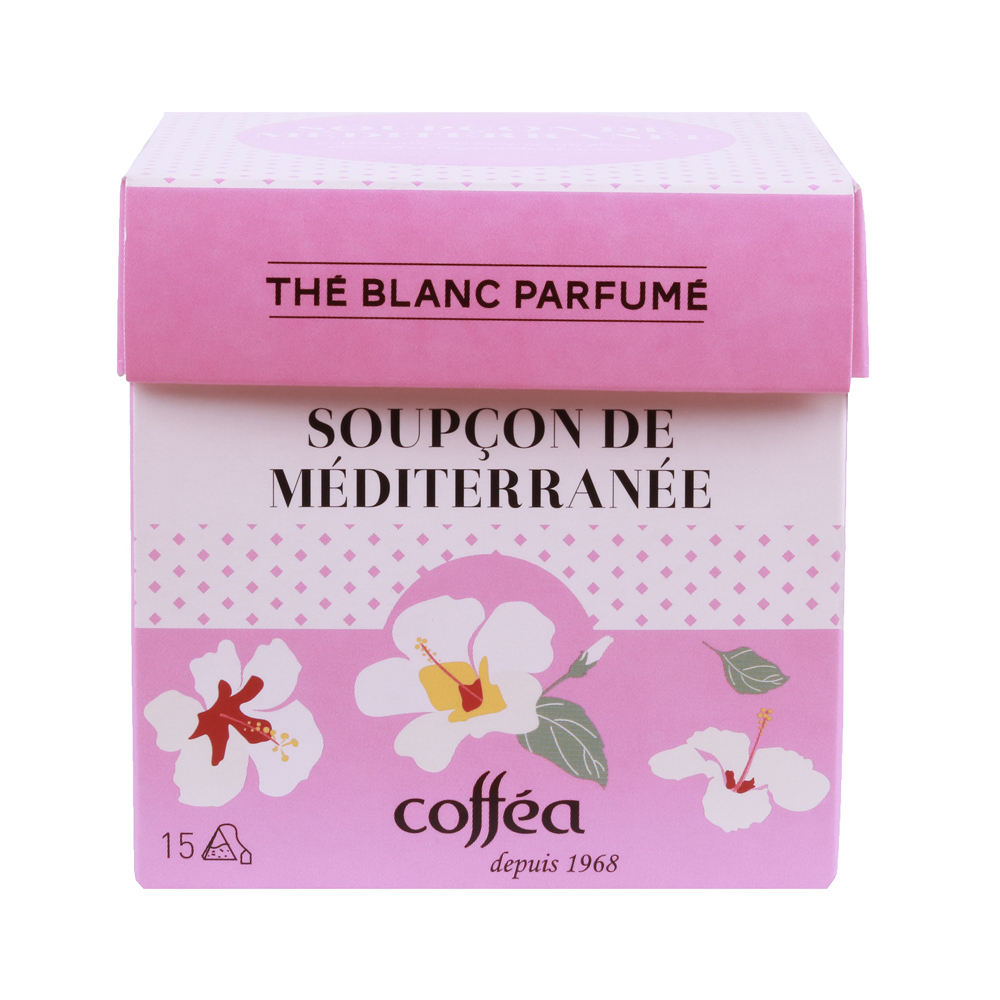 A Touch of the Mediterranean is a subtle blend of Mao Feng white tea and Chinese green tea, enriched with white hibiscus buds and jasmine pearls. This tea offers a lightly sweet and floral cup, with notes of jasmine and white flowers, leaving behind a gentle, tangy freshness. The white hibiscus buds, milder than red hibiscus, add a delicate and light floral touch, perfect for an aromatherapy moment.