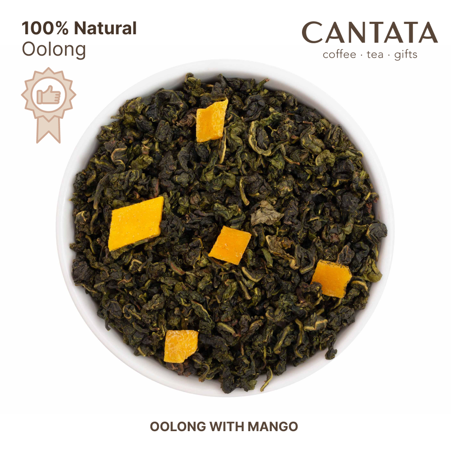 Oolong with Mango — a blend that captures the spirit of blooming tropics. Its base, Tie Guan Yin, is a delicate oolong with notes of lilac and tropical flowers, beautifully complemented by pieces of juicy candied mango that highlight its gentle floral sweetness.